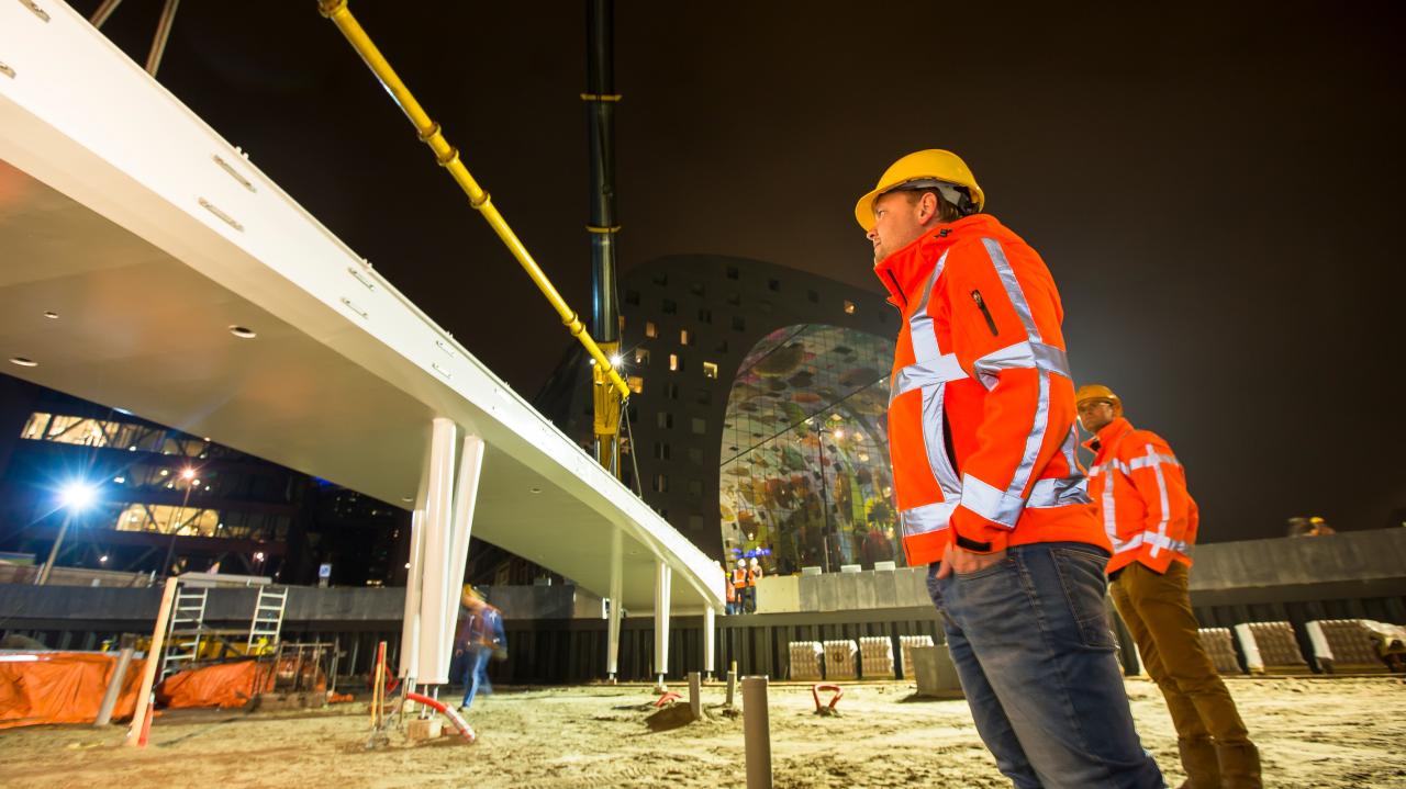 La place devant la halle du marché de Rotterdam a été transformée en 2015, à la demande de la ville de Rotterdam. Une passerelle a été construite pour traverser l'abri à vélos approfondi, qui relie le Blaak au marché. Une grue télescopique d'une capacité de levage de 400 tonnes a été nécessaire pour mettre en place le pont de 30 tonnes. Le pont a ensuite été recouvert d'un revêtement en pierre naturelle.